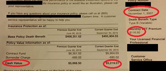 This particular policy you can see above was purchased at the beginning of November 2007, when the insured was 19 years old, for a death benefit of $400,000. The monthly premiums are $116.50, and the current cash out value is just over $5,200. To put that into perspective, a term policy for the same amount costs maybe $25 a month. To date (11/2007 – 09/2015), this person has paid out $11,067.50 in premiums.